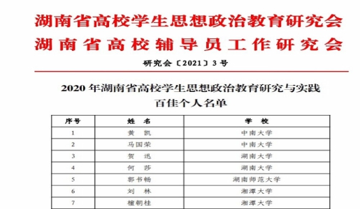 近日,在湖南省高校2020年研究与实践先进单位、百佳个人评选活动中,我院党委副书记黄凯荣获湖南省高校学生思想政治教育…