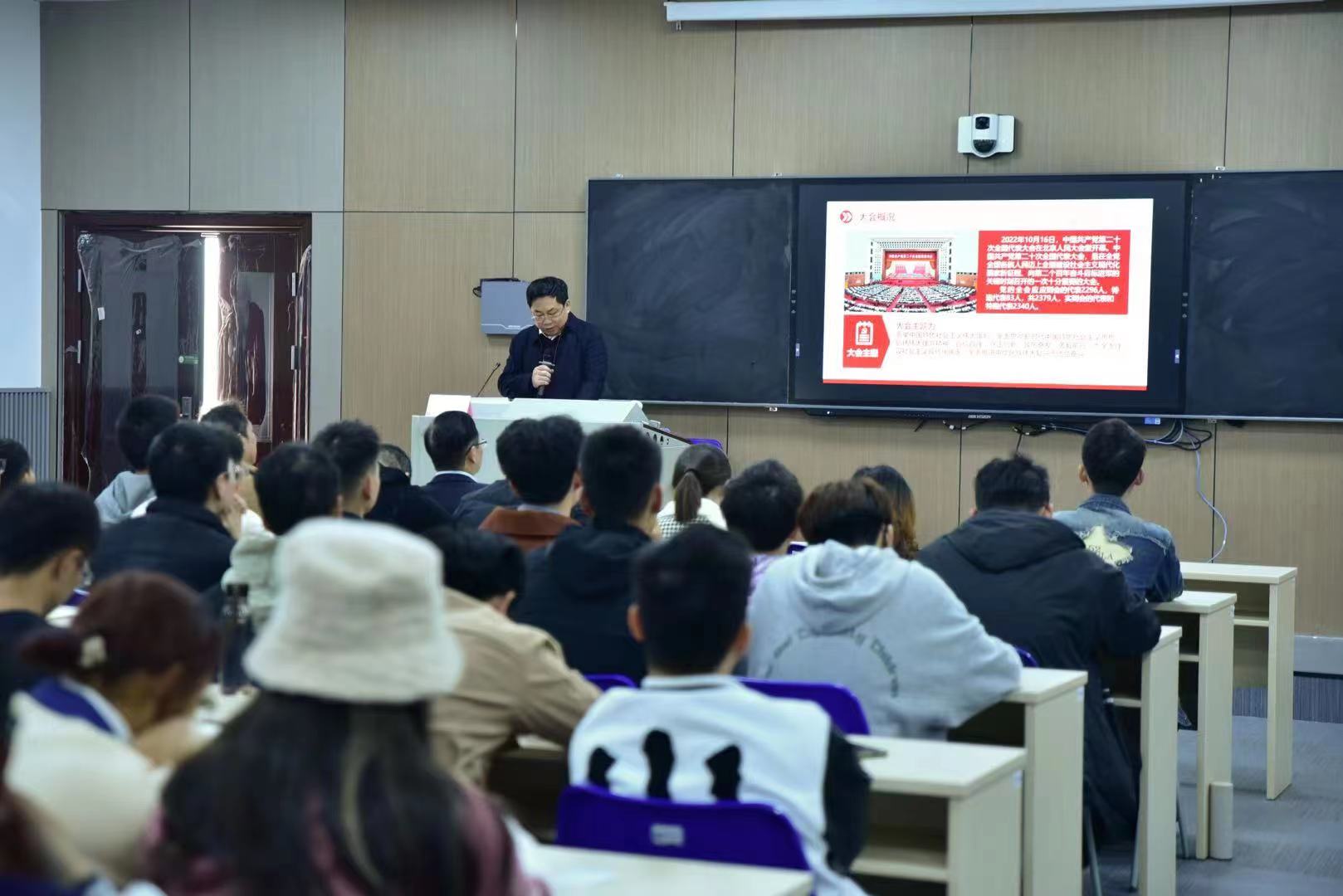 11月20日上午,校党委常委、副校长陈立章在中铝科技大楼C504智慧教室,以“深入学习宣传贯彻党的二十大精神,奋力推进学校事业内涵式高质量发展”为主题讲授党课,宣讲党的二十大精神。机电工程学院党委书记肖来荣、党委副书记黄凯,口腔医学院党委副书记吴世明,机电工程学院、口腔医学院师生党员聆听宣讲。