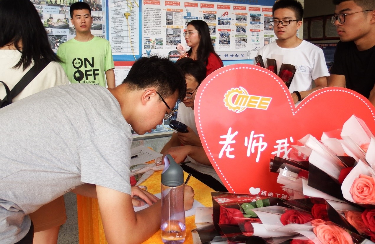 9月10日一大早,机电楼A座一楼大厅摆满了馥郁芬芳的玫瑰花,“机电院学子祝全体老师教师节快乐”的标语横幅悬挂在大厅中央,现场洋溢着欢乐的节日氛围。上午7时始,机电院老师和学生们陆陆续续地来到了活动现场,学生们纷纷在签名薄上写下对老师的真切祝福,领取鲜花送给老师,以鲜花寄托感恩之情,向老师表达敬爱。