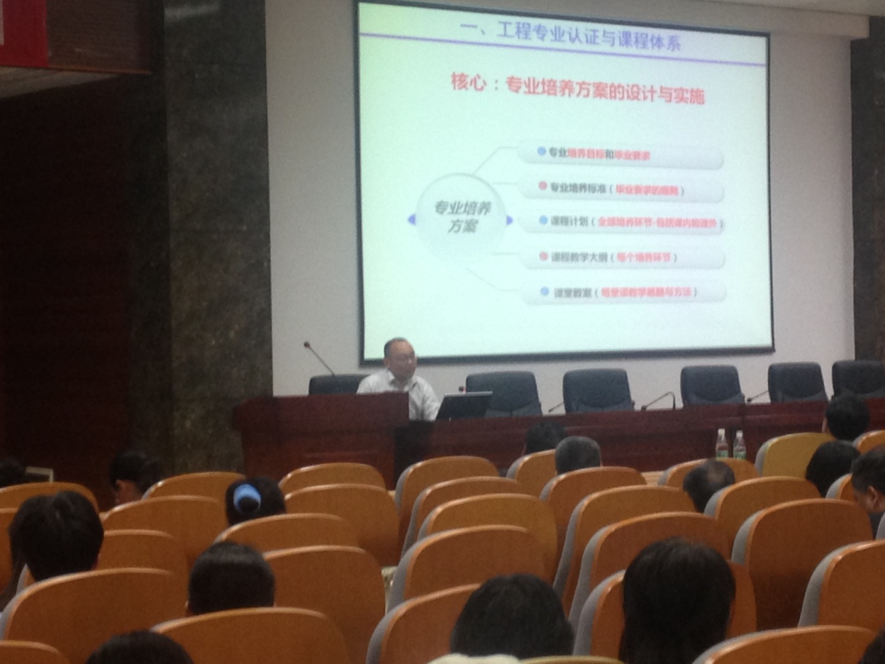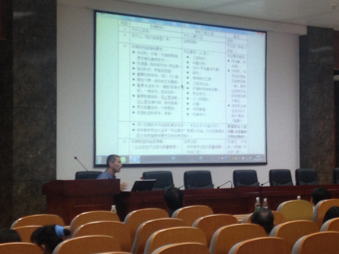 机电系李艳教授作为第一主讲人,讲授的内容是“工程教育专业认证总体情况”,她首先介绍了什么是工程教育专业认证,工程教育专业认证的背景及特点。然后从国际层面、国家层面、行业层面和学校层面介绍了为什么要做专业认证,进行专业认证的意义。最后介绍了专业认证主要做什么,阐述了开展专业认证的工作重点、认证标准及认证流程。 接下来车辆工程系欧阳鸿武教授基于“认证专业必须有明确、公开的毕业要求,毕业要求应能支撑培养目标的达成”的关系,以及“毕业要求要细化为可衡量、可评价、有逻辑性和专业特点的指标点(Performance Indicators)”的要求,对认证专业“毕业要求”的12条具体内容分层次进行了解读。其中,以购买汽车为例,将车辆档次类比与培养目标,汽车性能指标(如发动机功率,转矩,汽车的加速时间,制动距离,保修时间等)类比毕业要求,生动地解释了“毕业要求”的内在含义。 最后,郑煜教授向我们介绍了专业课程大纲的设计与实施,郑教授首先介绍了工程专业认证与课程体系的联系,落实毕业要求的专业课程大纲设计与实施,最后用汕头大学的实例进行具体实施过程的说明。 三位教授精彩务实的报告让全院老师进一步了解了工程教育专业认证工作对于机电工程学院本科教学工作的重大意义,也更加坚定了教师们做好专业认证工作的决心。 机电工程学院教务办