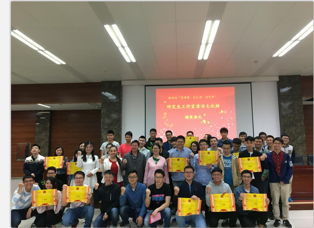 2017年4月28日上午,由机电工程学院研究生党支部与研究生分会共同举办的机电院“亮身份,见行动,当先锋”之研究生工作室清洁大比拼活动颁奖典礼在机电院B214学术报告厅隆重举行。出席本次颁奖典礼的嘉宾有机电院党委马俊副书记、机电院党委党组织干事何建仁老师、机电院研究生辅导员何婷老师。