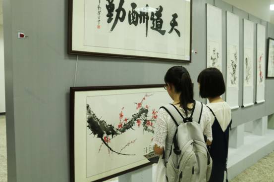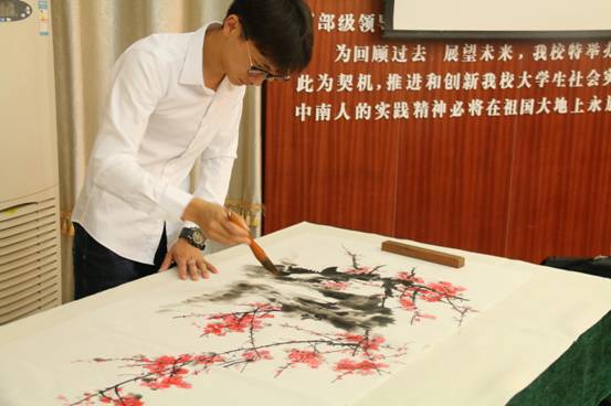 开幕式现场,郑洁宏同学即兴作画,为大家献上了一幅《梅花》,浓淡合宜、气韵生动,当即引热现场气氛。郑洁宏同学在大一时曾经选修过罗红胜教授的书法课,并对老师的指导一直心怀感恩。罗教授表示,工科学生在他的课堂学习后,能够举办个人书画展,他是第一次遇到,也感到非常高兴。而湖南省书法家协会副主席王希俊书记表示,自己也是工科出身,是研究生期间开始深入接触书法,由于兴趣一直坚持到现在。他为郑洁宏作品题词“梅花香自苦寒来”,同时肯定其艺术水准并激励他向着更为专业的方向继续努力。他说:“兴趣与工作的结合让生活和工作两方面同样受益。”
