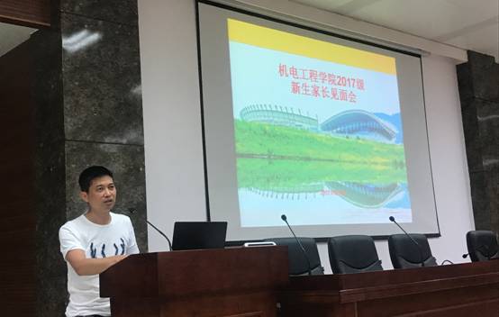 接着,年级辅导员周芳向家长介绍了辅导员工作及学生在校四年的专业学习要求和毕业要求,并向家长建议对孩子的成长要放手,但绝不“放眼”。班导师代表王聪向家长介绍了班导师工作。机械1706班龙荃同学的家长龙先生,作为家长代表发言,向在座的家长分享了自己培养教育孩子的经验和心得,向学院迎新的精心准备表示感谢,希望通过密切和学院老师的沟通联系,更好的培养教育孩子。