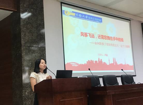 最后,学工办老师谭鑫,向家长做了亲子关系的心理小讲座,从心理学的角度,建议家长如何陪孩子度过大一这个关键期。
