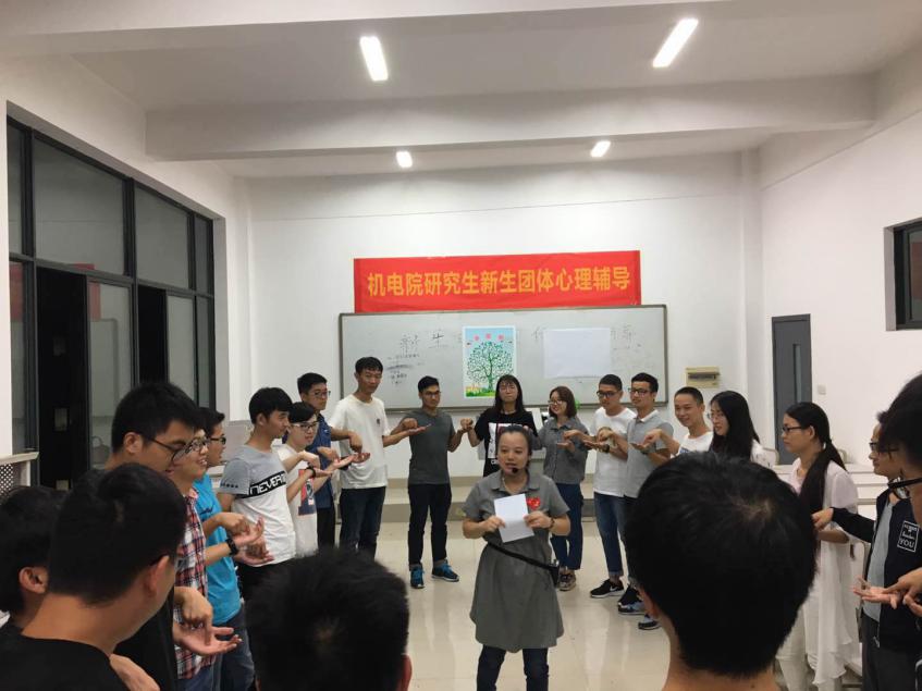 为了帮助2017级研究生新生尽快适应研究生生活,早日熟悉班级同学,促进同学们之间的交流,增强集体归属感,机电院研究生朋辈心理互助队积极组织了本次研究生团体心理辅导系列活动,并做好团辅老师们的助手。活动邀请到北大心理学硕士谭鑫老师;研究生辅导员、国家二级心理咨询师何婷老师;国家二级心理咨询师肖楚楚老师;国家三级心理咨询员江俊鑫老师;国家三级心理咨询员石越老师等五位老师。此次团体心理辅导系列活动于2017年9月20日至26日在机电楼C座505、506、508、B-C座大厅分别展开,以班级形式先后进行了7场,2017级240余名研究生参加了本次团体心理辅导活动。