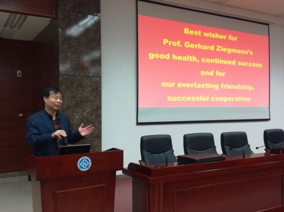 报告会伊始,吴老师首先回顾了Ziegmann教授与我院蒋炳炎教授课题组过去十周年的合作历史,对Ziegmann教授在中德合作PPP项目以及中国国家自然科学基金外国青年学者基金项目中所给予的支持表示衷心感谢,并对双方今后的深化合作提出美好愿景。随后邀请蒋炳炎教授向Ziegmann教授赠送了双方合作十周年纪念礼品。Ziegmann教授表达了真挚谢意,表示愿同蒋炳炎教授共同努力,推进双方合作不断前进。