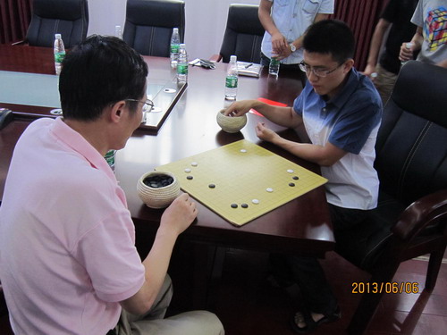 在谭青教授与围棋冠军龙泓羽的表演赛中,双方一攻一守,,十分激烈,围观者拍案叫绝。最终,龙泓羽同学获得了这场表演赛的胜利。