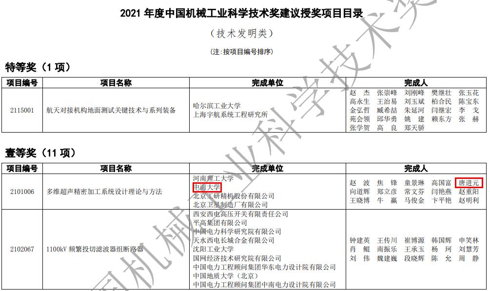 近日,中国机械工业科学技术奖励工作办公室公布了2021年度中国机械工业科学技术奖的获奖名单,我院四个项目榜上有名。黄明辉、黄始全参加的“800MN大型模锻压机关键技术及工程应用”、韩奉林参加的“隧道施工智能化作业机群自主研制及产业化应用”两个项目获得科技进步特等奖;唐进元参加的“多维超声精密加工系统设计理论与方法”获得技术发明一等奖;胡军科参加的“曲臂式智能升降工作平台关键技术研发与应用”获得科技进步三等奖。