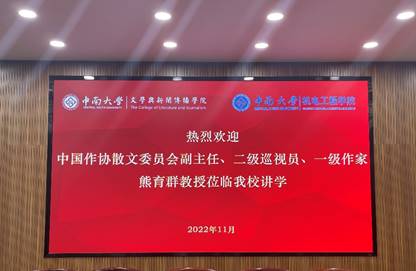 11月17日下午,中国作协散文委员会副主任、二级巡视员、一级作家熊育群教授应邀为机电院与文新院师生带来一场题为“从文化自信、传承到创作”的讲座。本次讲座为机电院与文新院共同举办,讲座由文新院阎真教授主持,罗军飞书记、刘新少副院长、聂茂教授出席了本次讲座。