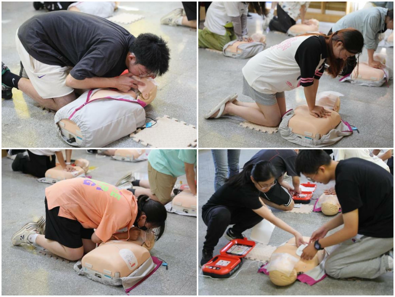 导师们深入浅出地讲解了急救环境评估的必要性、判断呼救的方法、心肺复苏30比2的操作技巧、使用自动体外除颤器(AED)的方法,学员们分批进行了确认环境安全、判断患者意识和呼吸、呼救120和求助身边路人、按照30比2进行心脏胸外按压和人工呼吸、使用AED的操作。学员们分组进行了完整的模拟急救演练,导师们在旁悉心指导,及时纠正错误操作。