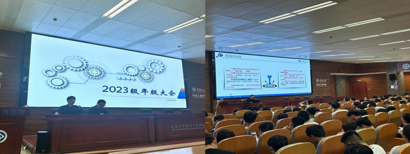 9月5日晚七点,机电工程学院2021级本科生年级大会暨线上家长会在中铝科技大楼B214报告厅顺利召开。大会由年级辅导员周芳、宋宁宇和刘璇主讲,班导师冯佩、周亚军、林赉贶和张毅出席大会,本科2021级全体学生参加会议。本次大会聚焦就业形式分析与能力提升指导,保研数据解读和重要时间节点提醒,考研情况介绍与规划建议,毕业生入伍政策宣讲,身心健康、谨防电诈、诚信应考等专题教育及学生日常工作布置五个方面内容,立足学生在当前阶段实际需求,内容涵盖生涯规划、安全教育、学术诚信等方面,为迈入大四年级的学生提供了全面的指导与建议,为学生后续的学习、生活与发展提供了有效参考。