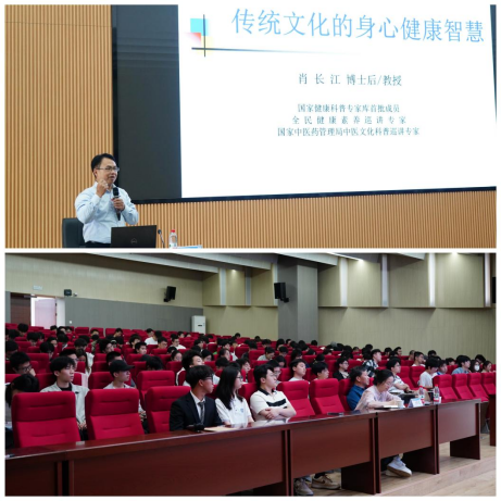 在热烈的掌声中,肖长江教授正式开讲。他以“如果把人比喻为电脑,传统文化就是装在电脑里的软件”为切入点,强调了传统文化对身心健康的重要性。