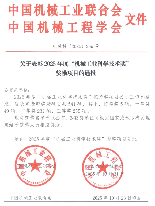 近日,2025年度“机械工业科学技术奖”获奖名单正式揭晓,我院荣获1项特等奖、1项一等奖。