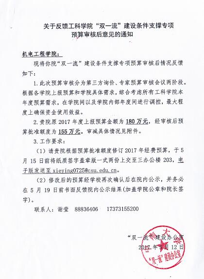 学校“双一流”建设办公室对我院2017年度“双一流”建设条件支撑专项预算审核后情况见附件《关于反馈工科学院“双一流”建设条件支撑专项预算审核后意见的通知》及《2017年度工科学院“双一流”建设条件支撑专项经费预算审核后情况表(机电院)》,现予以公示。公示期为2017年5月15日-17日,公示期间对公示结果有异议的老师,可向院综合办公室(A217)反映,电话:88879351,邮箱:luo_xh@csu.edu.cn。