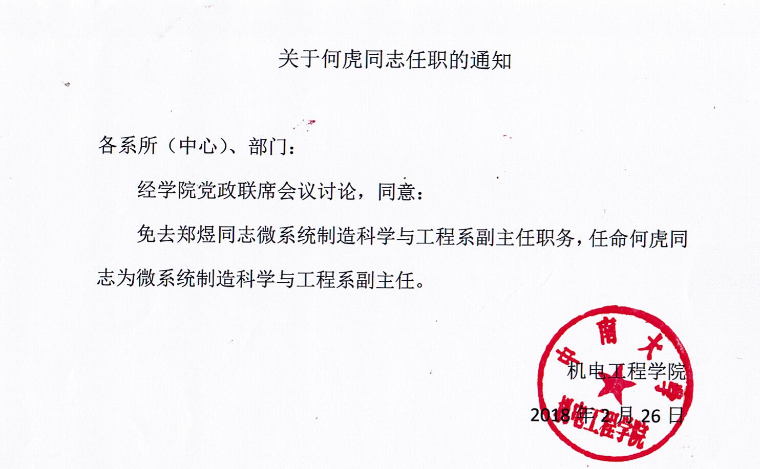 关于何虎同志任职通知