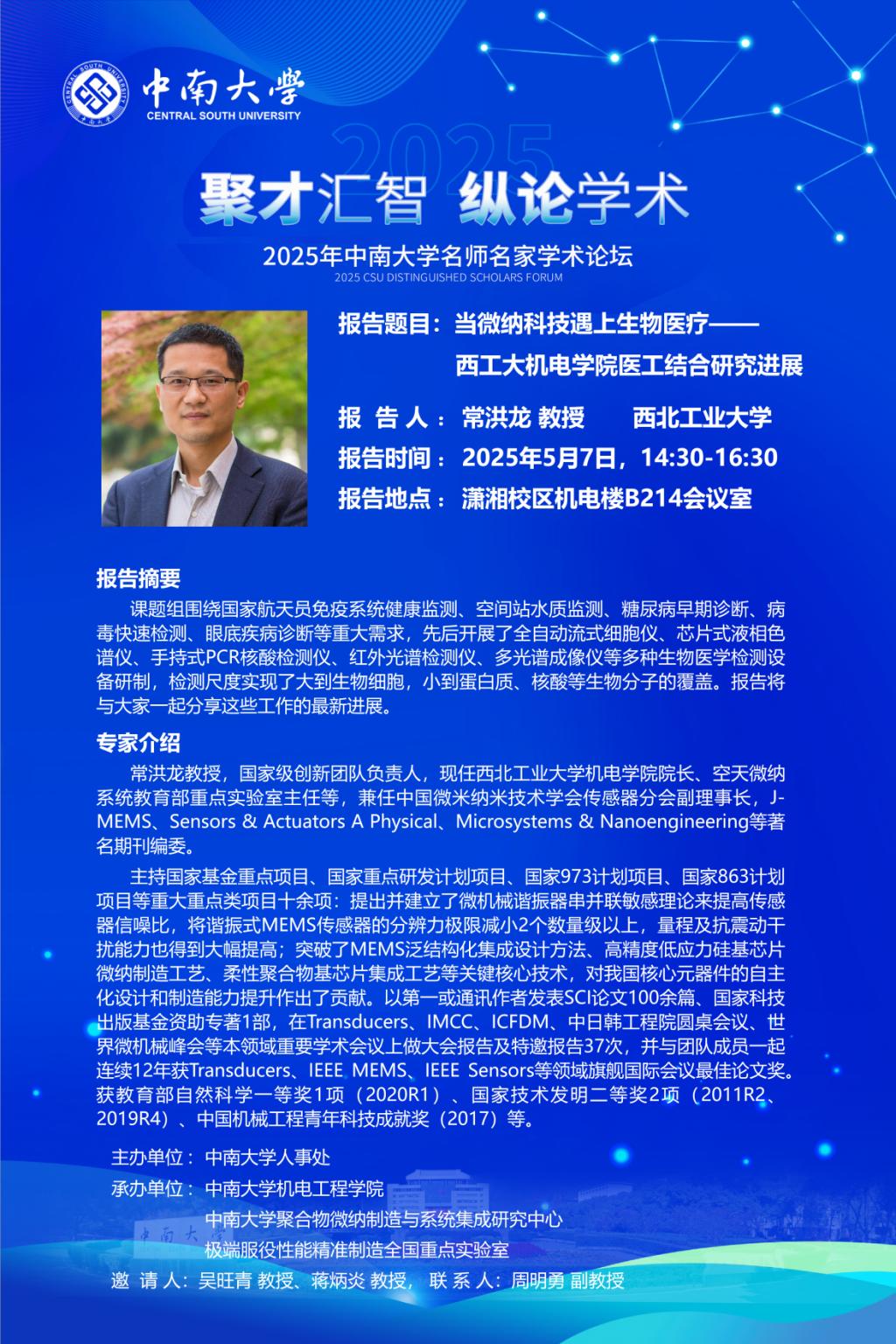 中南大学第五届国际青年学者湘江论坛机械工程分论坛学术报告预告