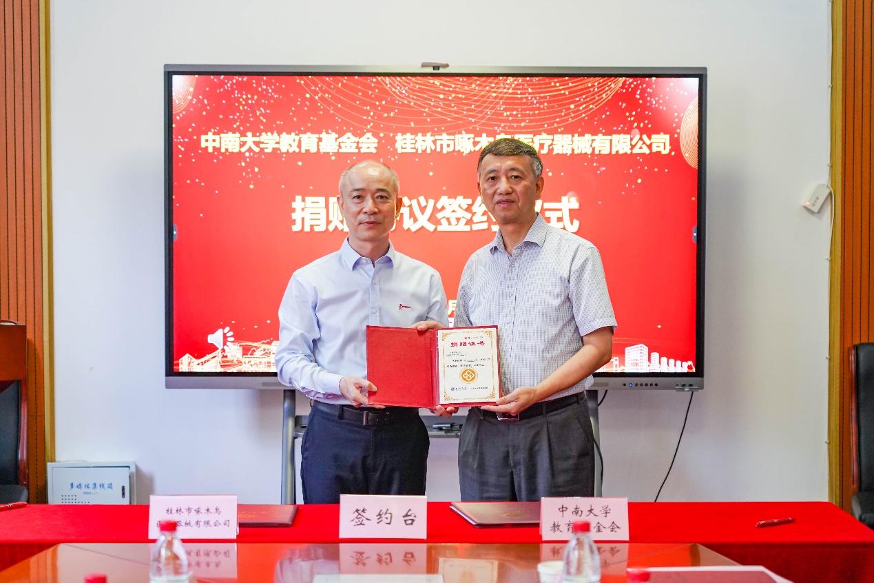 9月5日下午,中南大学与桂林市啄木鸟医疗器械有限公司在中铝科技大楼C208会议室签署捐赠协议,决定在我院设立“啄木鸟奖学金”。桂林市啄木鸟医疗器械有限公司董事长吴勋贤、副总经理林剑华、国际销售战区总监王国龙、机械工程部副部长唐鹏、人力资源专员...